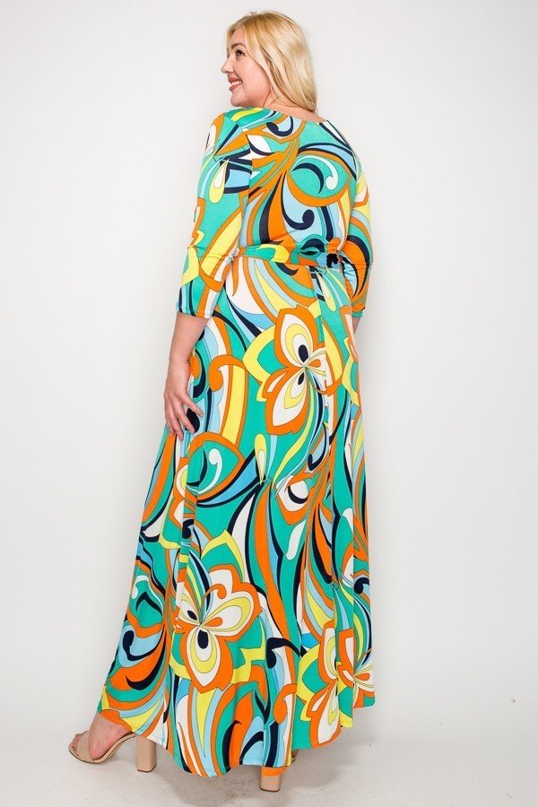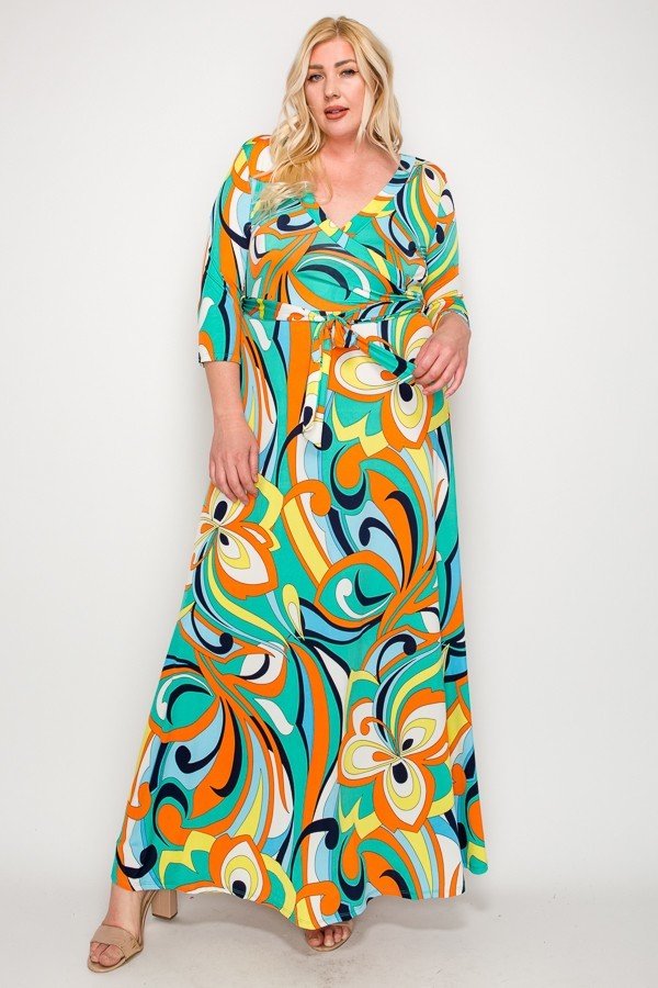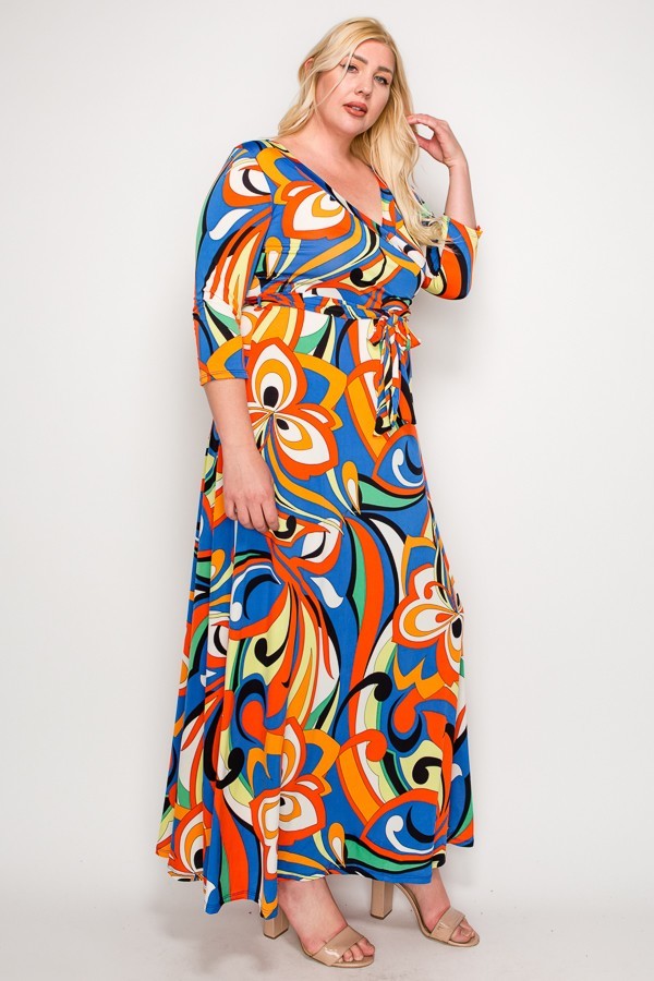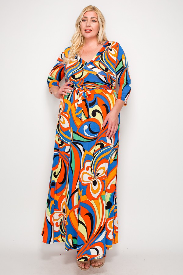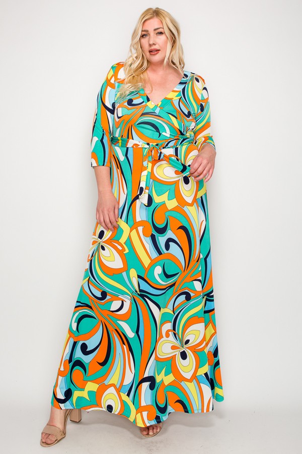 Venechia print 3/4 sleeve maxi wrap dress, 95% Polyester 5% Spandex